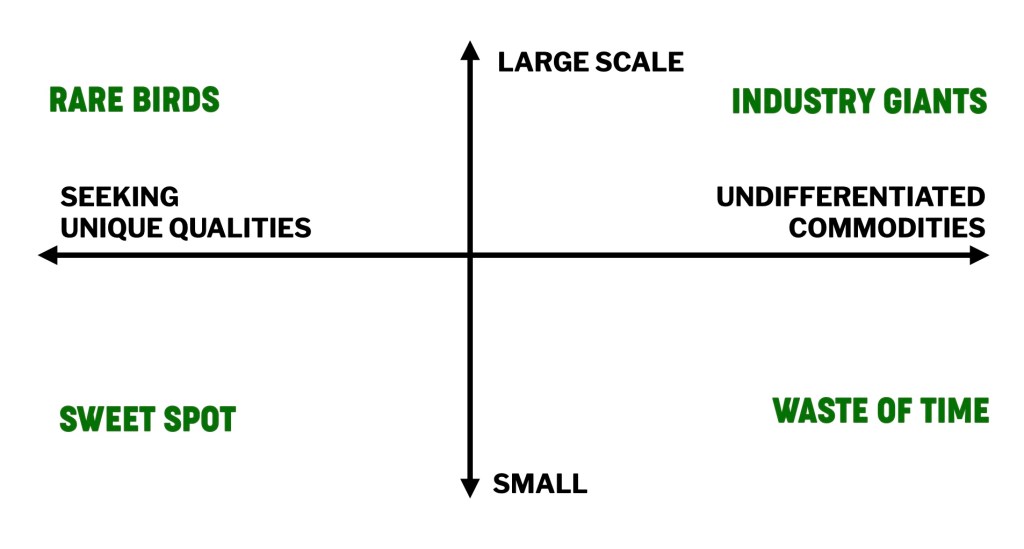 The industry giants need tonnage. You will find consistent, undifferentiated, commodity-priced work that is consistently delivered and can be hired. They won’t go out of their way to find freelancers who are unique, artisanal, or better. They just want to meet the spec at a fair price. They might even pay you on time.