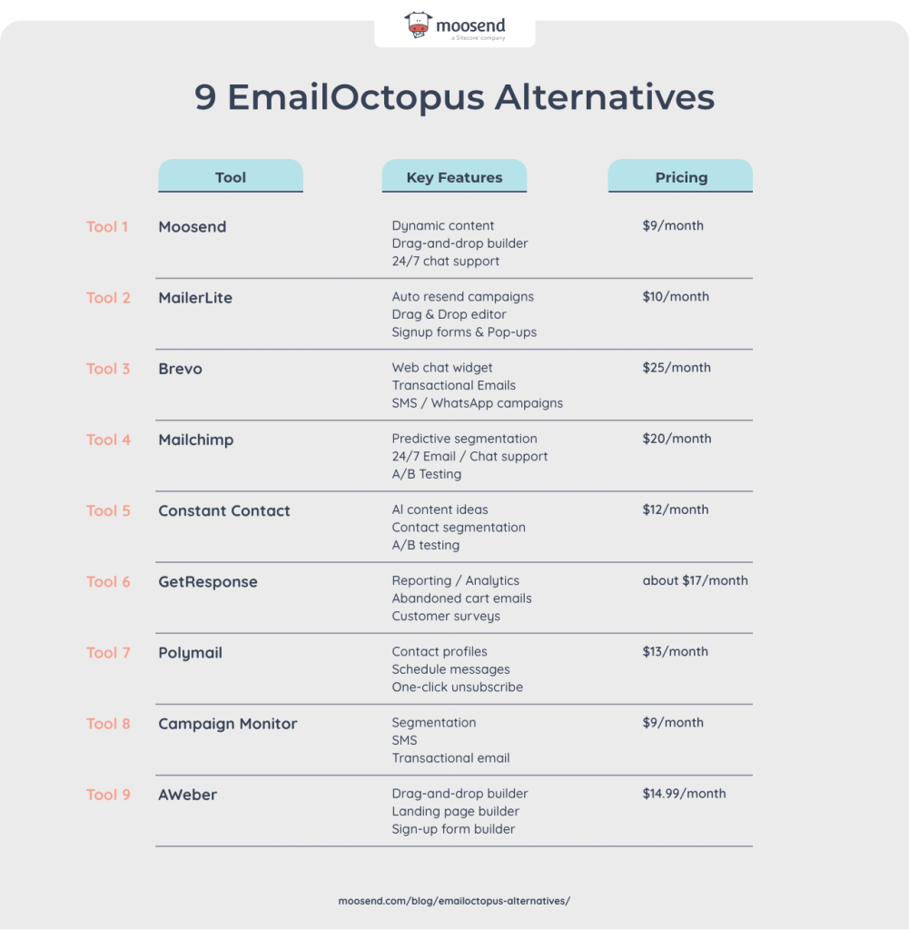 This guide will provide a comparison of the EmailOctopus alternative such as Moosend MailerLite and Mailchimp along with key features and pricing.