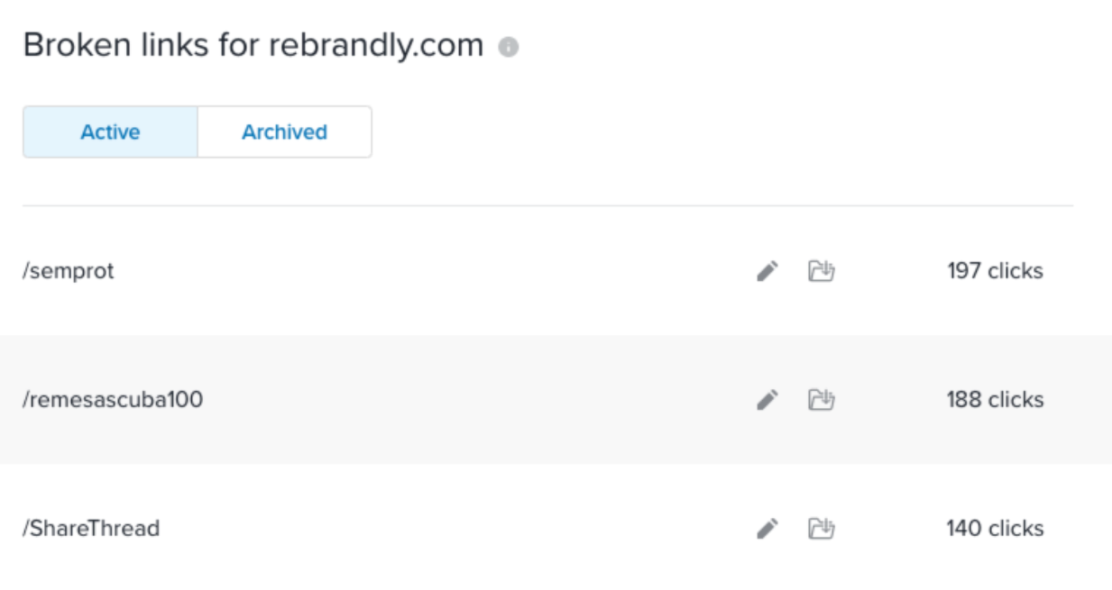 If you’re looking for a more robust solution, Rebrandly’s Broken Link Management solution allows you to monitor each of the domain names managed in your Rebrandly account, and see each of the broken links clicked in the last 30 days. As a bonus, these clicks exclude visits from bots/spiders, so you can rank your broken links based on their impact.Â
