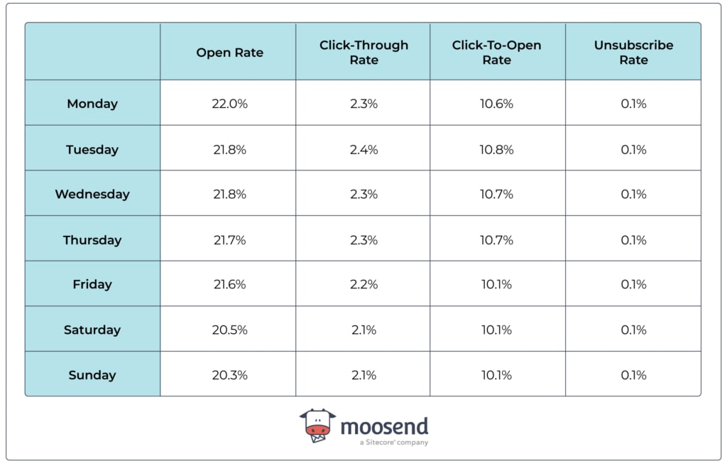 The differences are slight, but Monday wins in terms of average open rates, closely followed by Tuesday and Wednesday.